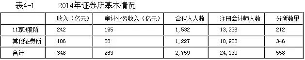 如表4-1所示,截至2014年12月31日,全国共有证券所40家,均已完成特殊普通合伙转制。2014年 证券所业务收入约为348亿元,占全行业总收入的59%,其中审计业务收入约为263亿元,同比增长11%;40家证券所共有从业人员约8.2万人,其中合伙人2759人,注册会计师24,139人(含拥有注册会计师资格的合伙人)。2014年度,40家证券所的证券业务收入约为67亿元,同比增长19%,增速较高,这与同期资本市场尤其是“新三板”较为活跃、发展较快有关。