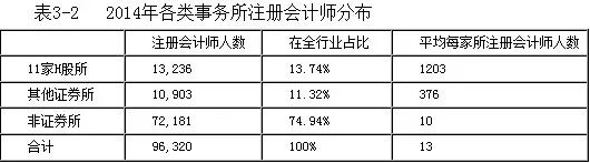 据表3-2进一步分析,注册会计师在事务所之间的分布并不均衡。从平均数来看,11家H股所平均每所拥有注册会计师1203人,其他证券所平均拥有注册会计师376人,非证券所平均拥有注册会计师10人。从总数来看,11家H股所的注册会计师占全部证券所注册会计师人数的一半以上。这在一定程度上表明,大型会计师事务所对注册会计师的聚合力更强、集中度更高。