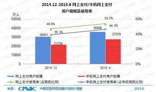 截至2015年6月,我国使用网上支付的用户规模达到3.59亿,较2014年底增加5455万人。与此同时,手机支付增长迅速,用户规模达到2.76亿。