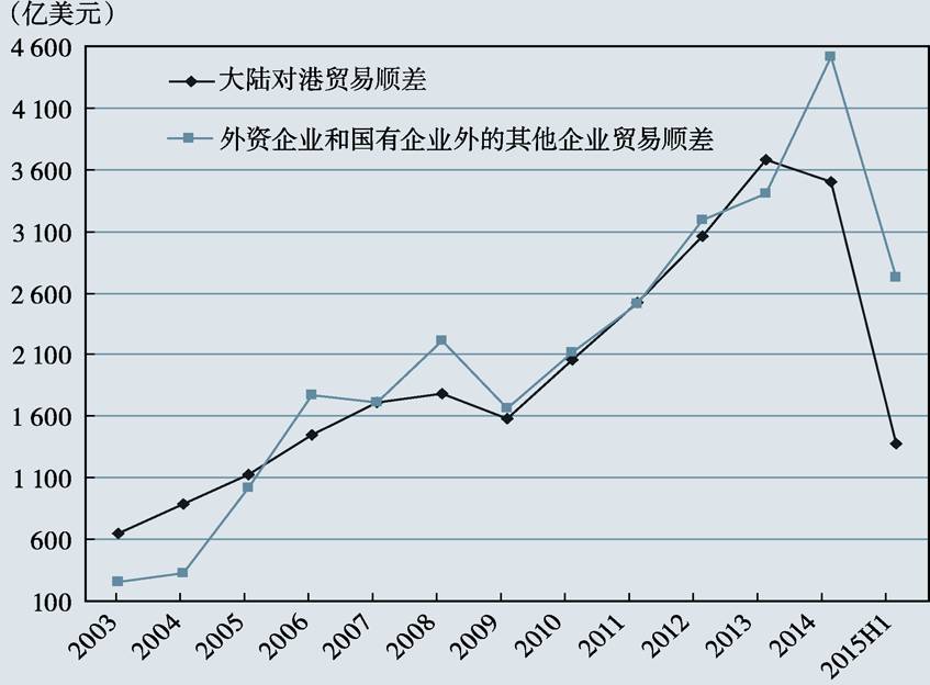 图1 2003~2015年上半年中国大陆与香港特区贸易顺差和