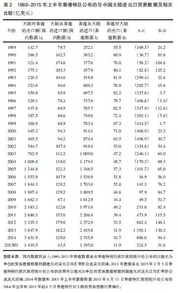 中国大陆公布的与香港贸易数据和香港公布的与中国大陆的贸易数据除有一定幅度的误差外,应该与香港自大陆的进口数据相当,但事实上双方公布的相应数据却存在着巨大的差异。表2给出了1989~2015年上半年香港政府统计处公布的香港从大陆的进口和向大陆的出口数据及与表1给出的大陆与香港贸易数据的差异。从香港特区公布的与中国大陆进出口贸易数据及与大陆公布的相应数据对比可以看出,1989~2005年上半年香港公布的从大陆的进口数据远超于大陆公布的对香港的出口数据;2006~2015年上半年,大陆公布的对香港特区的出口数据又远大于香港公布的香港从大陆的进口数据。从数据的变化可以直观看出,2006年以来大陆向香港的出口开始超过香港从大陆的进口,背后的原因是2005年人民币对美元升值之前跨境资金主要通过压低中国出口的方法撤离大陆,而2005年后却通过抬高出口流入大陆。两地贸易数据的背离是造成大陆与香港特区总贸易数据异常的主因之一,是跨境资金流出和流入所致。
