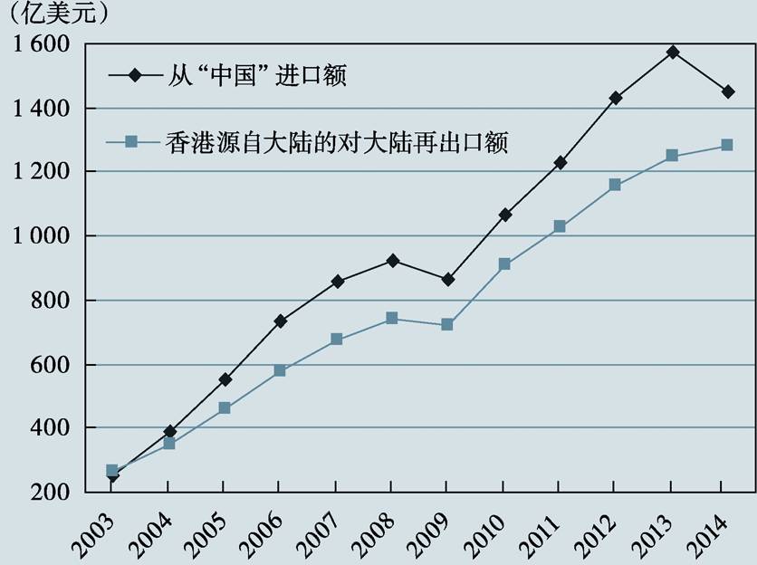 根据香港政府统计处的数据显示,香港特区对大陆的贸易中最重要的是转口贸易,2003~2014年间香港对大陆的转口贸易额从7 057.9亿港元增长到了19 558.2亿港元,与相应年份香港自大陆的总进口额相当。香港对大陆的转口贸易事实上包括香港源自大陆、美国、日本、欧盟等国家和地区的进口,通过香港包装后再向大陆出口的转口贸易,这种贸易形式近年来占据两地贸易的最大份额。这种将其他国家和地区通过香港转口的向大陆的出口也记作大陆自香港的转口进口的统计方法,与国内的外贸统计方法不一致。按照国内的外贸统计原则,其他国家和地区的产品通过香港出口到大陆的贸易,并不计作香港对大陆的出口,而记作转口出口。大陆从“中国”的进口额理论上应该相当于香港源自大陆的产品向大陆的转口贸易额。图2给出了2003~2014年间两者的金额比较。