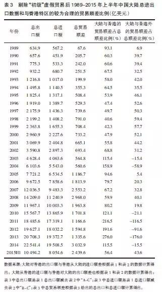 表3给出的中国大陆与香港贸易顺差占总贸易顺差的比例与表1相比更为合理:表1给出的比例中,仅有6年的数据在0~100%之间,属于较为合理的区间,而表3较为合理年份增长到了20年,不合理年份仅为2003年和2004年及2010~2014年的7年,清楚地证明了剔除“初级”虚假贸易数据方法的合理性。