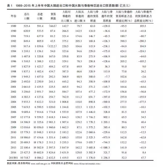 表1给出了1989~2015年上半年中国大陆出口、进口、贸易顺差和大陆与香港的相关贸易数据。表1显示,从1989~2015年上半年的26年半间,仅1997年、1998年、2006~2009年及2014年和2015年上半年的7年半时间,大陆与香港特区的贸易顺差占大陆总贸易顺差比重在0~100%之间的基本合理范围内,其它17年大陆与香港的贸易顺差远大于大陆总贸易顺差,且1989年和1993年两者方向恰恰相反,前者为顺差而后者却为逆差。考虑到香港人口和经济规模相对较小,1997年和2014年大陆与香港的贸易顺差超过大陆总贸易顺差90%实际上也不够合理。