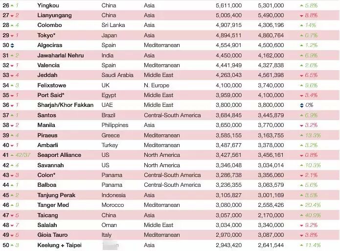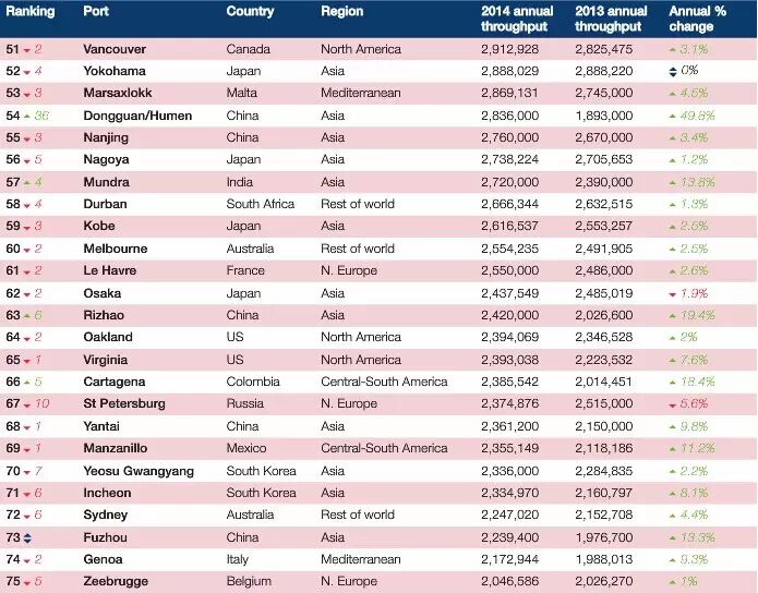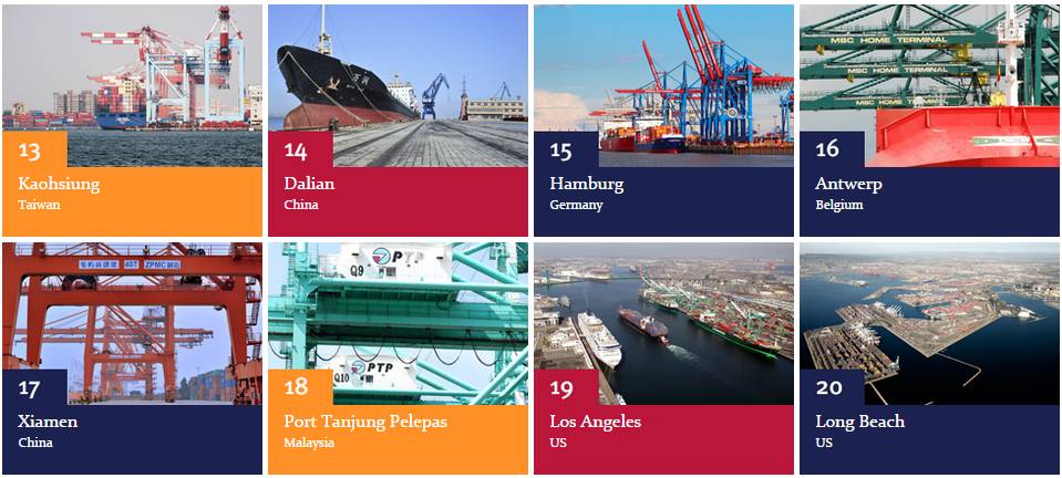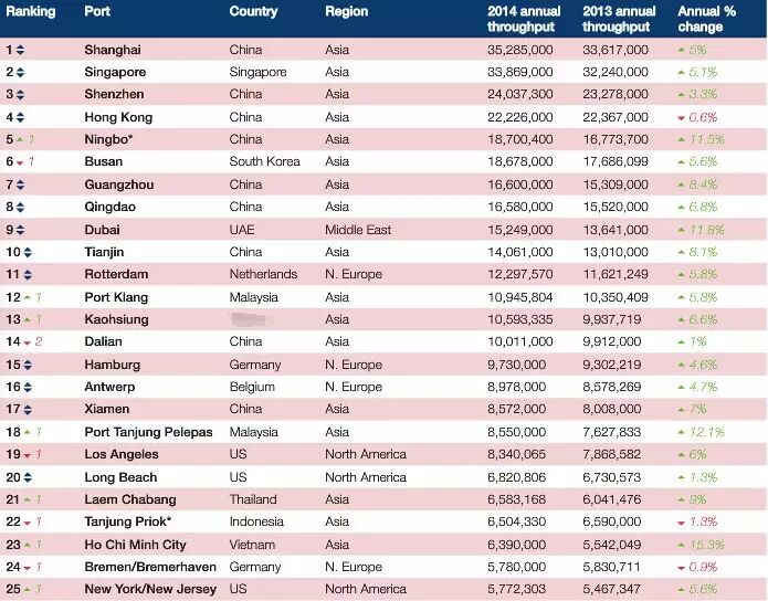 日前,全球航运权威媒体——《劳氏日报》揭晓了2014年度全球100大集装箱港口排行榜。 其中,前十强港口分别是:上海、新加坡、深圳、香港、宁波、釜山、广州、青岛、迪拜、天津。上海港排名首位,前十强中国港口占据七席。 第十一至二十位的港口分别是:鹿特丹、巴生港、高雄、大连、汉堡、安特卫普、厦门、丹戎帕拉帕斯港、洛杉矶、长滩。前二十强中国港口占据十席,其中大陆港口八席,港澳台地区两席。 前100强中,中国地区的港口还包括:排名第26位的营口港,第27位的连云港,第47位的太仓,第50位的基隆+台北,第54位的东莞虎门,第55位的南京,第63位的日照,第68位的烟台,第73位的福州,第85位的丹东,第90位的台中,第94位的中山,第95位的海口,第97位的汕头。