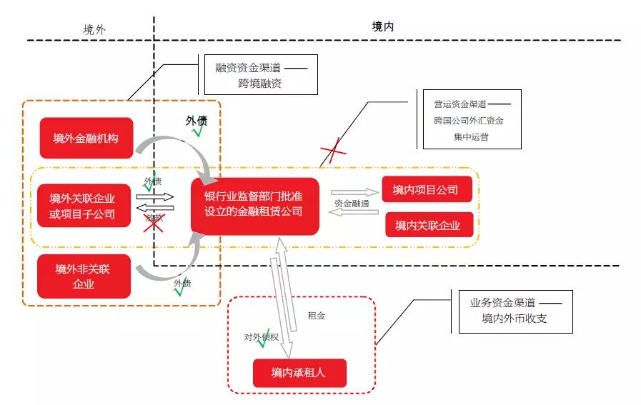 图2 内资融资租赁公司在现行政策下的各资金渠道情况 但中资融资租赁公司因自身通常没有或只有有限的外债额度,即使被纳入跨国公司外汇资金集中运营框架,集团整体可归集的外债资金规模也有限。