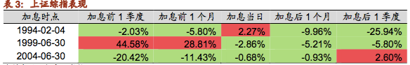 招商宏观此前的报告指出,1994年以来的三轮首次加息中,上证指数在首次加息后的1个月内都是下跌的,首次加息后一季度的表现也不佳,不过这可能和中国的国内因素关系更为密切,因为在1994年、2004年时,即使美联储加息前上证指数也处于下跌之中。不过,1999年中国股市曾经在前期暴涨,在7月开始调整,美联储加息可能是催化因素之一。