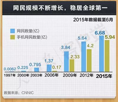 中国网民数量早在2008年就跃居全球第一,目前仍在增长中。截至2015年6月,中国网民已达6.68亿人,比整个欧盟的人口数量还要多。