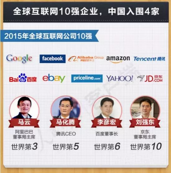 中国互联网企业突飞猛进,进入世界前列:全球互联网公司10强,阿里巴巴、腾讯、百度、京东4家中国公司入围。