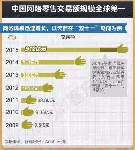电子商务改变了绝大多数中国人的生活,网购规模年年创新高。今年,仅天猫“双十一”一天就创下交易额912亿元,而美国的“黑五”当天网购的销售额仅相当于174亿元人民币,为天猫的19%。