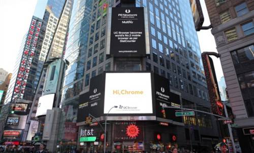 今年11月25日,UC浏览器在美国纽约时代广场打出“Hi,Chrome!”的标语。