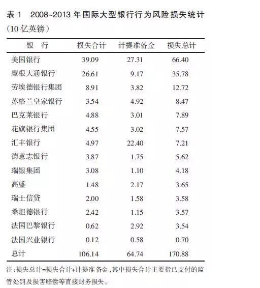 1. 数额巨大的监管处罚及损害赔偿。根据英国行为成本项目(Conduct Costs Project)研究基金会利用公开资料对国际银行业接受处罚情况跟踪研究得出的数据,2008~2013年10家顶级银行因不当行为交纳了1 000亿英镑的惊人罚款(见表1)。中国商业银行虽然未遭国际监管处罚,但国内监管力度也在不断加强。如发改委自2013年10月到2014年年底对各类商业银行150家分支机构收费情况进行了检查,实施经济制裁15.85亿元。可以说“法律风险正取代信贷风险”成为关键不确定因素。