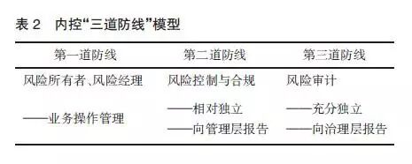 1. 完善内控“三道防线”。中国商业银行在进行相应的银行内控体系建设过程中,应注意突出对销售关键岗位的监督,在岗位设置及权责分配、业务流程等方面形成相互制约的内部控制机制,确保各岗位均在有效的监督与制约下开展相关业务活动。一是通过加大管理问责力度,强化第一道防线风险防范责任意识,进一步明晰第一、二道防线职责边界。二是通过“基于判断”的管理方法,完善风险与合规部门专业判断,提升其履职能力。三是通过在机构治理层层面,考虑相应的公司治理结构安排,确保内控、内审部门独立性(见表2)。