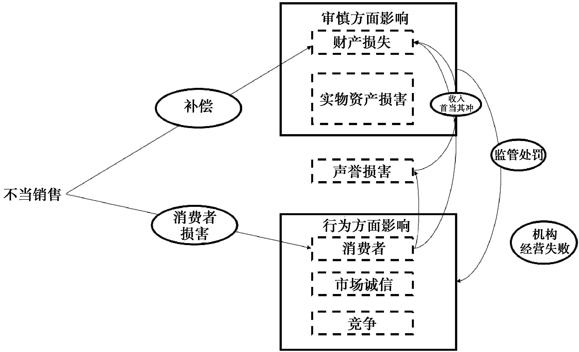 7. 损失影响。三大风险给金融机构造成的损失主要是财产损失、实物资产损害等方面,而行为风险在给金融机构带来损失的同时,会给消费者和金融市场带来损害。以私售这种特殊的不当销售行为为例,来具体分析风险事件在不同方面产生的影响(见图1)。在审慎方面,私售行为使原本可以在银行续做的理财业务被其他机构抢占,同时还造成了客户存款的流失,对银行本身的业务发展和经营收入都产生了影响。在行为影响方面,私售行为到期不能兑付,侵害了消费者的权益,在触发监管处罚造成财务损失的同时,声誉损害会促使银行营业收入下降。而金融机构审慎风险累积到一定程度,将破坏客户对银行机构的信任度,最终导致金融机构经营的失败。可以说,行为风险与操作风险的具体事件是高度重合的,但事件的影响,以及风险传递的路径完全不同。