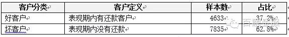 模型开发目标是预测客户未来还款的可能性。如果客户在有效的委外催收期间(3个月)内发生了还款行为,则认为客户是好客户;如果客户没有还款行为则认为客户是坏客户。样本中坏客户占比为62.8%。