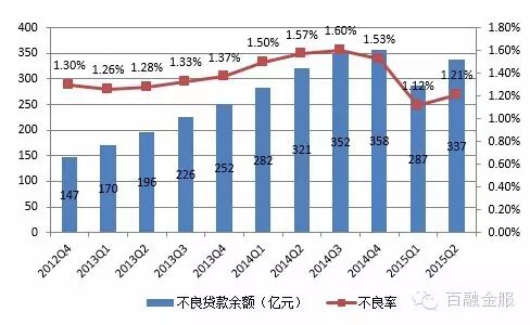 信用卡是个人信贷业务的代表性产品,以信用卡为例,截止到2015年第二季度末,信用卡不良贷款余额[2]达到了337.33亿元,信用卡不良率达到了1.21%。从发展趋势来看,2012年以来,信用卡的不良贷款规模持续增长,尽管在今年1季度末出现了回落,但目前在趋势上仍不能完全脱离增长的通道。另外,也需要注意,上述不良资产规模数据已经经过了银行的核销处理,历史累积不良资产规模要高于该数字。
