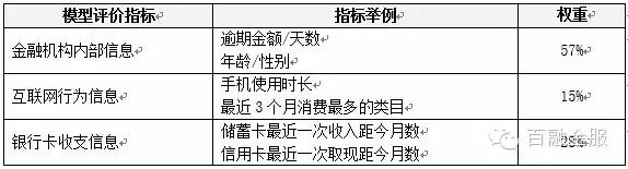 模型最终结果主要包含三部分的信息:金融机构内部信息、互联网行为信息和银行卡收支信息,三部分权重见下表。