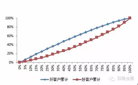 将客户评分从低到高进行排序,并等分分成20组,描绘好客户累计和坏客户累计曲线。基于该模型结果,样本客户评分主要集中在400至600分之间,客户违约率随着评分的升高快速降低,模型具有良好的风险排序能力。