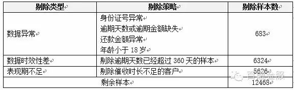模型开共采用25981个客户样本,剔除部分不能满足模型开发要求的客户,最后剩余样本数共计12468个。