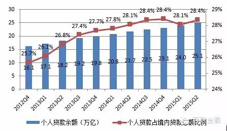 截至2015年2季度末,仅纳入统计范围内的行业存款类金融机构、信托投资公司、租赁公司和汽车金融公司,其所经营的个人信贷业务规模就超过25万亿,个人信贷占比稳步增长。从业务规模总量及规模占比来看,都仍处在稳步增长的阶段。而尚未被监管机构纳入统计范围内的其他消费信贷企业、互联网金融企业、以及实际经营个人信贷的其他机构与个人,其经营的个人信贷资产总规模已达到一个非常庞大的数字。