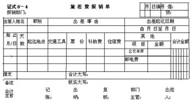 系专供员工因公出差,报支差旅费使用的原始凭证,并兼代记账凭证,其内容、格式如证式6-4;并按白纸兰字(线条)印刷。根据出差的实际情况,及有关事宜的原始单证,和规定的补贴标准等,依格式界定的项目,分别计算汇总填列。如涉及外币支付,应另单填报,并在备注栏注明“币种”,以便识别。