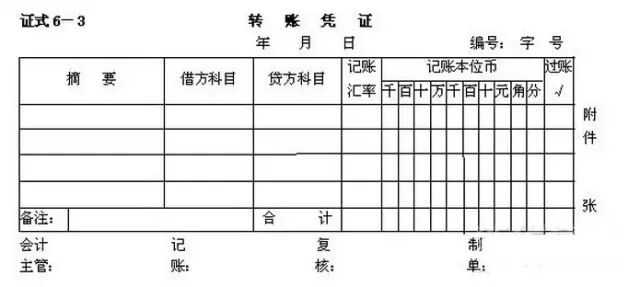 系专供办理非现金交易事项账务处理使用的记账凭证,其内容、格式如证式6-3,并按白纸绿字(线条)印刷,以符传统会计惯例。主要系根据经济个体内部的交易事项,如因生产产品领用原材料,产成品的入库与出库,资产折旧、折耗计提与摊销,应收应付、预收预付账项的整理调整、结算,以及会计错误的更正等具体工作需要而填制。另外,如年终结算时涉及外汇资产、负债账项的调整,则应将外币的“币种”、金额,在摘要或备注栏内注明;其借、贷科目及金额,分别填入相应各栏的同一行。