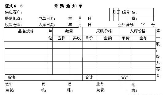 系供办理原材料、商品、物资采购业务,及会计工作使用的一式五联内部凭证,其内容、格式如证式6-6;第一、五联用白纸绿字(线条)、第二联兰字(线条),第三、四联粉红色字(线条)印刷,以资识别。