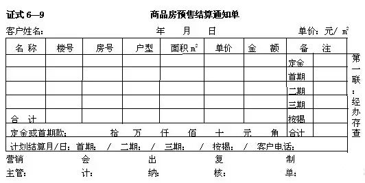 5、第五联转交营销部门主管,凭以了解掌握售楼业务进展、资金回笼情况,和做好正式签订商品房买卖合同的准备工作。由此可见,“商品房预售结算单”在了解掌握售楼业务进展,加强财务管理,做好楼款催收以及业务工作,都将起到良好促进作用。