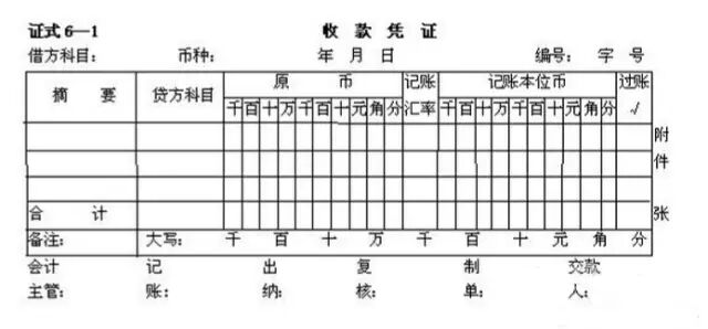 系专供办理现金、银行存款(包括支票、汇票等票据)收入事项使用的记账凭证,其内容、格式如证式6-1,并按白纸红字(线条)印刷,以符传统会计惯例。在会计实务中,系根据交款人缴纳的现金、银行支票等票据及有关足以说明交款数额、内容、性质或事由的原始凭证编制。如为人民币,直接填入“记账本位币”栏即可;若为外币,应注明“币种”,并将外币金额填入“原币”栏,再按“记账汇率”折合为人民币,填入“记账本位币”栏。收款凭证的现金科目本身为借,填于凭证的左上方;对应的贷方科目、金额及摘要,分别填于相应栏的同一行;“记账本位币”栏的合计数,为借方现金科目的金额。