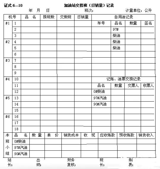 系供经营液体燃料业务企业,对加油站交接班工作记录及日销量统计,供作办理销售业务和财务结算的计算依据的一式二联单;其内容、格式如证式6—10,并用白纸绿字(线条)印刷;“机号”栏可根据其加油机数量及轮班的班数,作适当的调整变动。