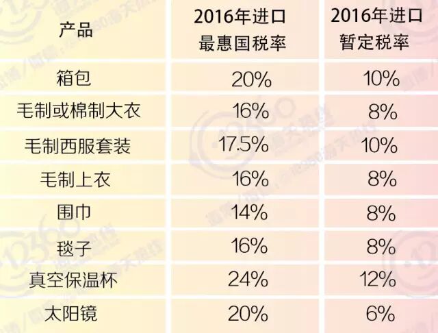 为进一步促进境外消费回流,拉动境内消费,2015年6月1日起,国家已对进口服装、化妆品等14项日用消费品实施降税。从2016年1月1日起,将进一步扩大日用消费品降税范围,再对16项日用消费品实施降税。这些降税商品有: