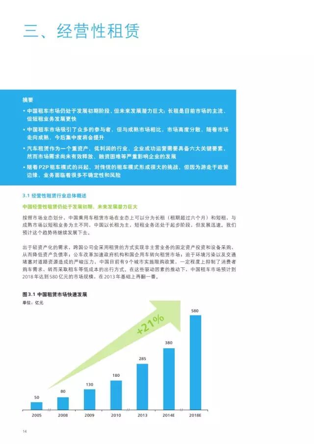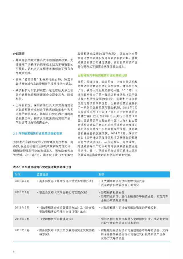 中国汽车融资租赁发展仍处于早期阶段,市场规模正随着专业汽车租赁公司、整车厂、经销商及银行系融资租赁公司的积极加入快速增长;另外越来越多的城市推出汽车限购限牌政策,将为汽车融资租赁市场创造强有力的需求支撑。