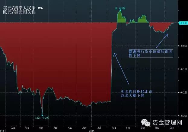 中国资金管理网记者12月21日撰稿,鉴于欧美货币政策分化,且未来很长时间内欧元/美元都将保持弱势。那么当欧元贬值时,基于CFETS人民币汇率指数兑一篮子货币的要求,人民币将势必变得更贵,若要保持人民币长期稳定的局面,则美元/人民币将不得不走高。法国巴黎银行预计,欧元/美元和美元/离岸人民币的负相关性将出现套利可能,并且未来走强的概率将比现在更为明显。根据近一年来的数据统计,欧元/美元下跌10.17%、美元/离岸人民币上涨5.47%,市场预计欧元/美元将在2016年末跌至1.06,而美元/在岸人民币升至6.6水平。