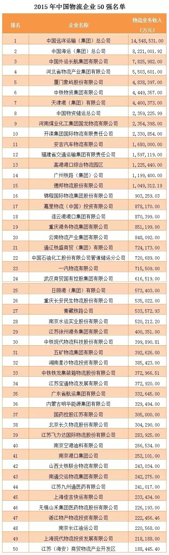 2015年50强物流企业总营收合计为7931亿元,按可比口径计算同比增长1.9%,50强里第一名没有变化,仍是中国远洋运输(集团)总公司,总营收为1454.8531万元。最后一名有变化,由江苏(海安)商贸物流产业开发区代替去年上榜的新时代国际运输服务有限公司,其营收为18.8445万元。很遗憾的是,如今正发展迅猛的顺丰速运(集团)有限公司没能入选。以下是详细名单。