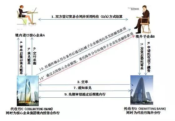 境内核心企业A拟向香港境外分公司B进口一批光学设备,双方在贸易合同中约定以跟单托收方式(D/A)结算。B企业托收行及结算行均为境内代收行C的香港分行D。由于境外分公司B在香港地区成立不久,未能获得D分行的独立授信,但其希望在核心企业A公司对单据承兑后提前获得应收款项,用于支持其后续业务经营。在知悉境内核心企业A已携境内外子公司(含B公司)一起获得C银行跨境集团式授信额度的基础上与当地监管部门进行了前期沟通,经确认同意后通过D分行向境内行C申请出口托收款融资。经C银行审核符合供应链融资管理下的放款条件,在规定的比例范围内向B企业发放了相关款项,并由D分行办理了入账。