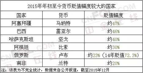 此前俄罗斯、哈萨克斯坦相继宣布实施自由浮动汇率,两国货币业均已大幅贬值。加上美联储加息背景,2015年对于许多新兴市场货币而言并不太平。彭博社分析报道称,至少有四个国家的盯住美元汇率政策被放弃,另有六个被削弱。到了下半年,贬值浪潮愈演愈烈。