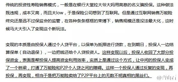 深圳有家p2p公司叫广金所,成立一年交易额破100亿,CEO是前陆金所财务总监,骨干全来自平安。但其实,它是姚振华的公司。昨晚大家探讨马明哲如何通过P2P,把万能险卖给无数不明真相的屌丝们。