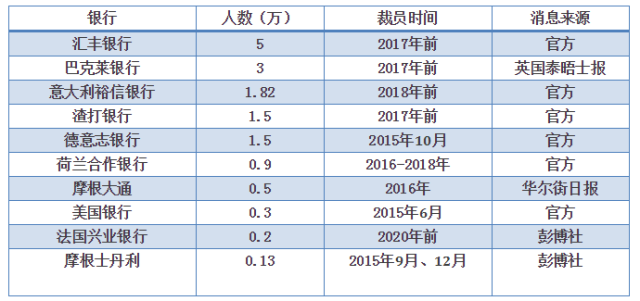 全球各大银行在业务方面有很大的裁员空间:随着手机银行的增加,银行零售业务环节的人数减少。投资银行也存在很大的成本削减空间。这也是各大银行官方在裁员时最喜欢给出的理由,没有之一。