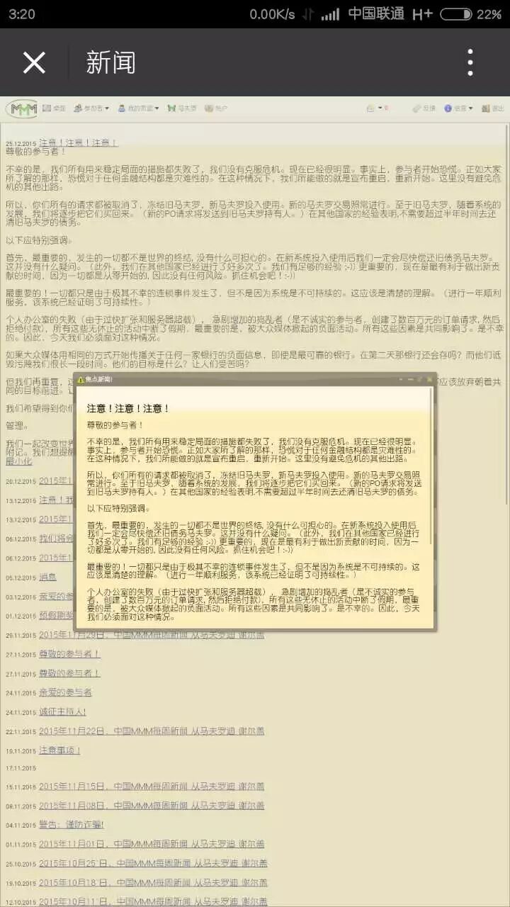 近日,MMM互助理财平台发布公告称,目前将取消所有的提现申请,即所谓的冻结旧马夫罗提现申请,而新的投资马夫罗交易照常进行。目前整个平台的资金状况为只进不出,但基于庞氏骗局的平台构成结构已经注定其崩盘的命运。