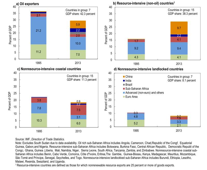 IMF报告还指出,相比非洲大宗商品进口国,中国对出口国影响力增长更为明显(图4)。这是由于:1)贸易对出口导向型经济体比进口导向型经济体更重要;2)出口导向型经济体贸易的中国份额比进口导向型经济体更大;3)对于出口导向型经济体,出口价格和中国经济活动变化方向一致,进口导向型经济体反之。