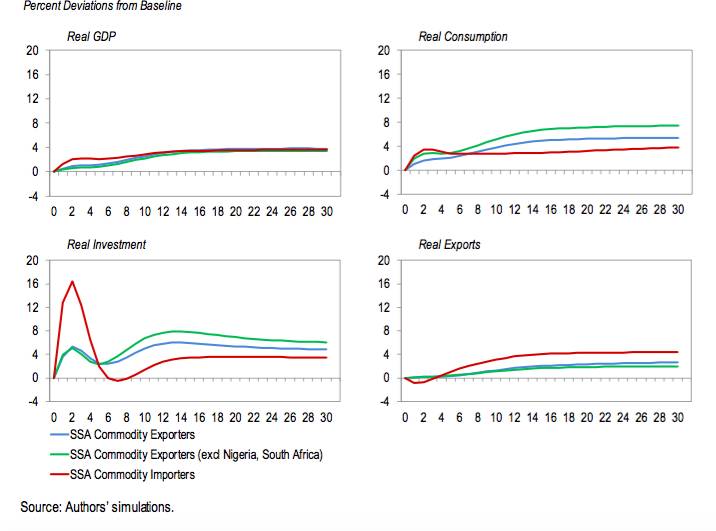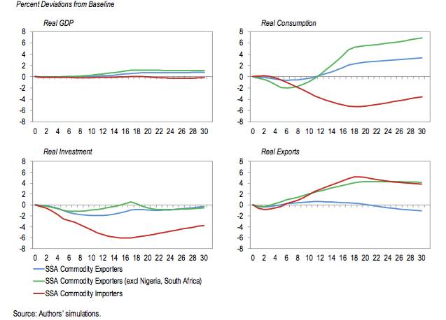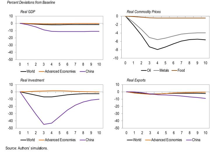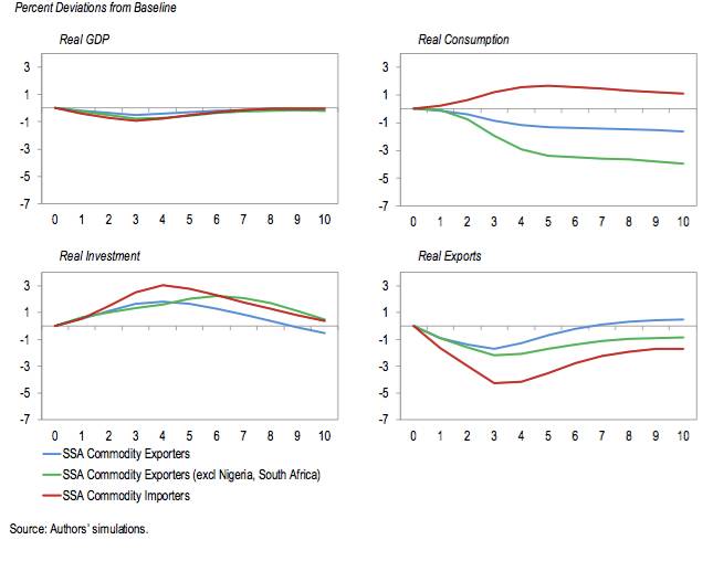 首先,在第一个情境下,中国经济增速放缓最初被视为周期性减速,后被认为永久性下降。此情境下,全球实际GDP会比基准线降低1.6%,大宗商品实际价格也较低,比如油价会比基准线低8%。由于全球大宗商品低价红利,中国经济增速放缓对非洲大宗商品进口国的净效应接近为零,而对非洲大宗商品出口国GDP总体上会有0.5%的负面影响。