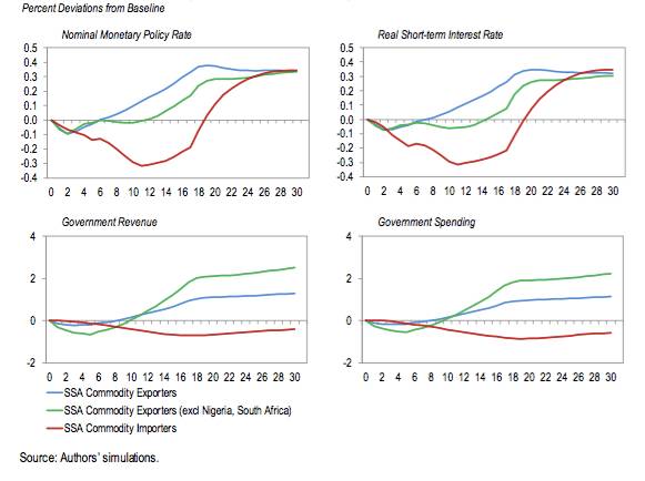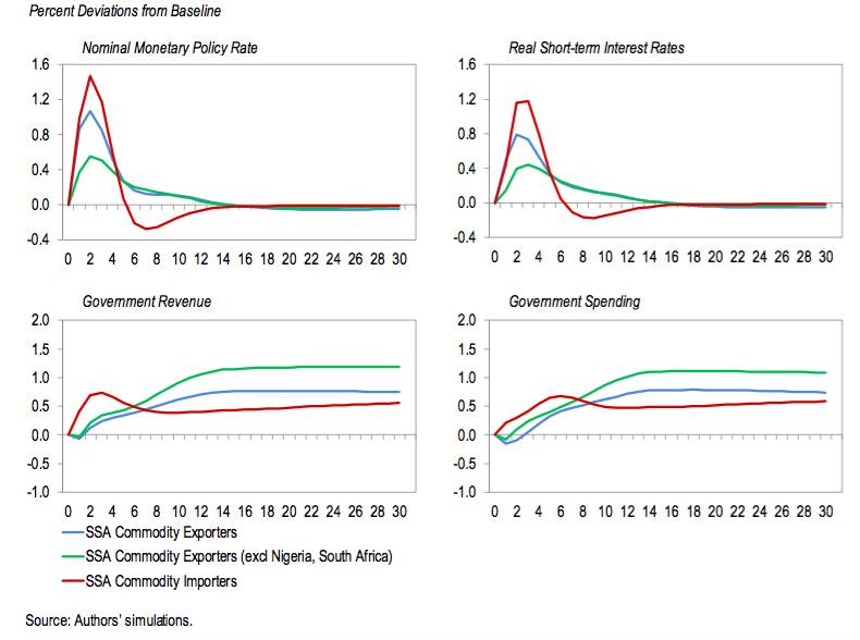 货币政策在一段持续时间内维持较低的实际利率(图8)。出口国财政支出降低,但是支出的减少程度较弱、不足以弥补其财政收入减少。进口国财政收入因较强的国内需求而略微上升,政府得以增加开支。