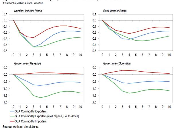中国经济增速放缓对全球实际GDP具有不容忽视的影响力。据IMF估算,全球实际GDP将比基准线低1.6%有余。发达经济体实际GDP缩水十分有限(较基准线下降最多至0.7%,后反弹稳定在0.2%),但主要新兴经济体的国内需求将下降,令非洲出口市场整体规模收缩(图6)。实际GDP的全球性下降将引起大宗商品需求的下降,全球石油、金属、粮食等大宗商品实际价格会随之下跌,进而波及大宗商品出口国。