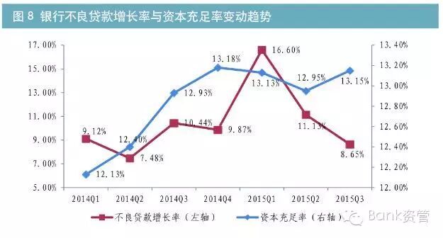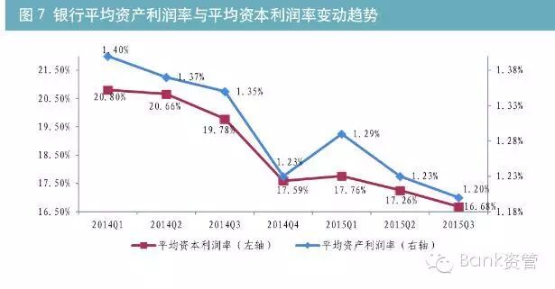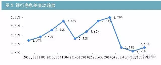 在资产收益率一路下行的情况,为提高回报率,投资机构纷纷采取拉长久期的策略。反映到数据上,长久期的公司债与国开债的信用利差显著收窄,其中9年期AAA公司债的收益率甚至低于10年期国开债,出现倒挂(见图6)。像9月24日万科公开发行的公司债,5年期中标利率为3.5%,与5年期国开债到期收益率相比,信用利差也几乎为0。自2012年来,银行通过自营或借道各种通道方式,将资产配置到房地产和地方政府融资平台,并形成了大量的高收益信贷和非标资产。自2014年以来,随着存量高收益资产的逐渐到期或被置换为低收益资产,银行的投资收益率出现大幅下行,相关业绩指标也呈现下降趋势(见图7)。根据银监会公布的商业银行主要监管指标情况(法人口径,下同),截止2015年三季度末,商业银行不良贷款余额11863亿元,较上季度增加944亿元,商业银行不良贷款率达到1.59%,较年初上升0.20个百分点。关注类贷款余额2.8万亿元,比年初增加7145亿元,比上季度增加1665亿元。贷款损失准备合计22634亿元,较上季度增加972亿元,拨备覆盖率由一季度末的211.98%下降至190.79%。自2014年第一季度以来,银行业不良贷款季度环比增速依次为9.12%、7.48%、10.44%、9.87%、16.60%、11.13%、8.65%;虽然不良贷款暴露有所趋稳。但银行业整体不良贷款和不良率双升的趋势仍在延续。2015年四季度,由于经济增速依然下行,企业经营困难加大,预计银行不良贷款仍将继续攀升。在2014年的四个季度中,商业银行平均资本充足率分别为12.13%,12.40%,12.93%和13.18%,资本充足率逐季度增加。但进入2015年,银行资本充足率开始下跌,一季为13.13%,二季度进一步下降18BP至12.95%。虽然三季度回升至13.15%,但在当前经济形势及不良贷款持续增加的情况下,预计2015年内,为了满足监管资本的要求,银行依然面临一定的资本压力(见图8)。不良贷款、拨备、资本三者密切相关,不良贷款的增加将直接影响银行的拨备、利润和资本。根据银监会公布的数据,银行业三季度较二季度多计提损失准备972亿元,将直接导致银行税后利润减少729亿元(=972*(1-25%企业所得税率)),由于当年净利润直接转为“未分配利润”(核心资本的组成部分),因此三季度新增拨备会导致当年净利润及核心资本直接减少729亿元。虽然由于拨备的增加幅度大于不良贷款余额的增加,会导致银行超额拨备增加28亿元(=972亿元-944亿元)。而超额拨备属于附属资本的核算范围,因此超额拨备的变动会导致附属资本增加28亿元。上述两个因素合计导致银行监管资本减少701亿元(=729亿元-28亿元)。而二季度,由于损失准备的计提(836亿元)及不良增加大于拨备的计提(258亿元),导致银行监管资本减少885亿元。2015年二至三季度,银行监管资本合计减少了1586亿元(=701亿元+885亿元)。在满足资本充足率10.3%要求的前提下,上述监管资本的减少将直接导致银行新增资产的形成能力降低15398亿元(1586亿元/10.3%)。而这仅是二季度和三季度的不良资产增加导致的。考虑全年不良资产的增加规模,银行监管资本减少的更少,迫切需要增加利润,以对冲不良资产对利润及资本的侵蚀。从货币政策层面看,央行多次下调存贷款基准利率,存款利率浮动区间持续扩大,存款保险制度建立等,导致银行负债端成本持续攀升。但国内宏观经济增速放缓趋势未变,企业盈利能力逐渐下降,致使信贷需求不足,制约了银行贷款定价能力,导致银行净息差收窄,2015年初,净息差收窄趋势尤为明显;二季度末银行整体净息差为2.51%,较上年同期下降0.11个百分点,为2012年以来最低水平,虽然三季度净息差略上升至2.53%,但较上年同期仍下降0.15个百分点(见图9)。与此对应,银行盈利能力出现下降,2015年前三个季度,在银行总资产同比增长14.78%的情况下,银行业累计实现净利润12925亿元,同比增长仅为2.21%。其中三季度单季度实现4210亿元,较二季度减少69亿元,环比降低1.61%。同时,2015年第三季度,商业银行平均资产利润率1.20%,同比下降0.15个百分点;平均资本利润率为16.68%,同比下降3.1个百分点,均为2012年以来的最低水平。为解决高收益资产匮乏、利润增长乏力的困局,目前银行较多采用的策略,是降低信用评级准入、加大杠杆或拉长久期,很多投资机构也采用了这种策略,所以市场会出现长期债券收益率的下行和信用利差的收窄。但在经济下行趋势没有改变情况下,银行化解存量不良已经压力重重,从审慎经营的角度出发,笔者并不推荐银行采用上述应对策略。由于面临越来越严厉的资本监管,银行可投资资产总量受到资本的限制,不能超过资本的12.5倍。银行增加资本的手段有限,主要包括增发股票、发行长期次级债券、可转换债券和混合资本工具等,应更加注重资本的收益率,提高低风险资产占用的资本的比例。因此笔者建议银行重构大类资产的配置方向,并提高以下两类资产的配置规模,在风险可控的情况下,提高资产收益率。自2012年资产证券化业务重启以来,截止2015年10月9日,证监会主管的企业资产支持证券存量规模1423亿元,银监会主管的信贷资产支持证券存量规模3532亿元。由于目前投资者对资产支持证券的认可度尚待提高,因此存量资产支持证券的发行价格相较公司债而言,具有一定的优势。同时根据《商业银行资本管理办法(试行)》(中国银行业监督管理委员会令2012年第1号),投资高评级资产支持证券化能够有效节约风险资产,提高资产收益率。银行传统