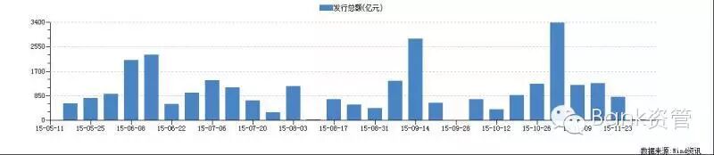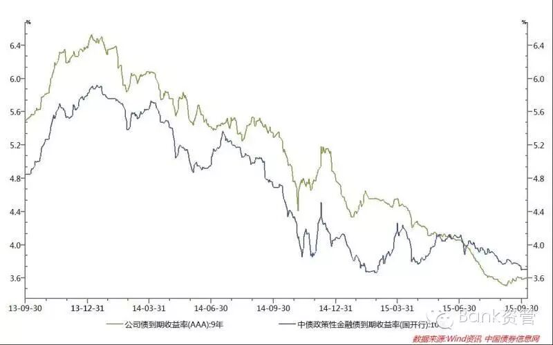 号)发布。以此为标志,我国对地方政府性债务的治理进入新阶段。国家开正门、堵偏门,通过鼓励以地方政府发债的方式缓解地方政府债务压力并置换存量债务。地方债务置换是指在财政部甄别存量债务的基础上,把原来地方政府通过各种途径形成的短期、高息债务(包括银行贷款、BT、城投债、信托融资等)置换成长久期、低成本的地方政府债券,旨在引导地方政府规范化、透明化融资。2015年,全国人大批准下达了6000亿元的新增地方政府债券额度和3.2万亿元的地方政府债券置换额度。自2015年5月份,地方政府债务置换正式驶入快车道。下图为地方政府债的发行情况。截至2015年11月底,地方政府债发行规模达3.7亿元,全年的发行任务基本完成(见图1)。地方政府债的发行利率几乎清一色紧贴投标利率下限。即使是10年期的债券,发行利率也一直在4.2%以下,大幅低于同期贷款基准利率(见图2)。根据国家统计局公布的数据,2015年以来房地产开发投资增速持续回落:1-8月房地产开发投资增幅已降至3.5%的水平,相比去年同期降10个百分点,创下本世纪以来最低增幅。同时,越来越多的房地产企业通过发行交易所公司债,满足资金需求。截至9月30日,30家地产公司共公开发行公司债48只(期),募集资金规模1254亿,13家地产公司非公开发行公司债共26只(期),募集资金规模381亿元。目前,整个房地产市场仍然处于去库存阶段,新开工和投资下滑趋势尚未扭转,三四线城市房地产市场尤其严峻。房地产投资意愿下降,正规发债渠道放开及低成本公司债的大量供给,导致房地产行业高收益、低风险资产供给大幅萎缩,甚至出现了低成本房地产公司的公司债对存量高成本融资的替换,进一步加剧了资产荒。随着传统高收益资产供给的减少,大量流动性开始寻找投资新领域,以替代高收益资产,并直接推高了上半年的股市。但2015年6月份以来,股市去杠杆导致各类股市衍生高收益资产迅速收缩,大量此前参与股市的资金开始从股市撤出。近期,虽然IPO重启,但是针对新股申购政策进行了调整,取消预缴款,意味着IPO开闸对债市资金的分流依然有限。对于债券市场,由于打新基金对打新股的依赖程度降低,其只能增配固定收益债券,因此债市需求猛增。即使是在地方政府债券加码发行、交易所政策利好导致公司债供给增加的三季度,面对巨量,债券发行利率依然出现了一路下行。由于债券需求与供给的失衡以及相对宽松的货币政策,自2015年3月起,债券到期收益率一路下行,引领了一波债券的牛市行情,从1年期到10年期,各期限信用产品的到期收益率都明显下降(见图3、图4)。
