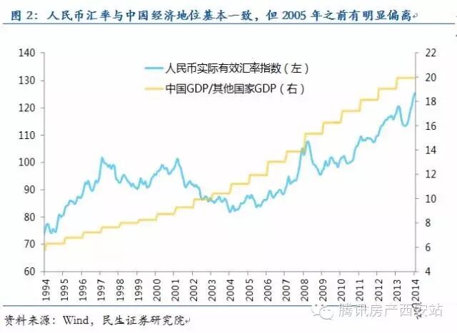 再来说一下人民币的问题。中国过去一直是一个高速增长的“X国”,因此人民币也一直是炙手可热的“X币”,自1994年汇改以来基本保持了单边升值趋势。1994年到2014年,在人口红利、改革红利和开放红利的推动下,中国经济地位直线上升,与其他国家GDP的比重从6.3%大幅提升到20%,人民币实际有效汇率也随之从75升值到125,升值幅度接近70%。尤其是2005年二次汇改以来,人民币和中国经济手牵手一骑绝尘。