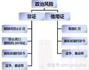 3、政治风险是指在进出口买卖双方均无法控制的情况下,承担付款义务的国外进口方或其银行,因其所在国家或地区政治或政府行为导致进口方不能按时支付出口方货款。政治风险常见的情形如下图所示。