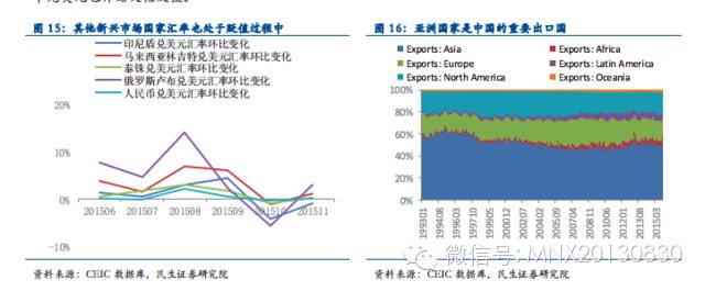 本轮人民币贬值过程的同时,当前许多新兴市场国家由于面临资本流出风险,其货币也同样处于贬值过程之中。在美元升值、油价暴跌、商品价格下滑的背景下,俄罗斯卢布暴跌,马来西亚、印度、泰国和印尼的货币均遭抛售,这些贬值都将弱化人民币贬值对中 国的提振作用。多数新兴市场国家汇率走势与人民币保持一致。除此之外,发达国家的货币兑美元也开始大幅贬值。