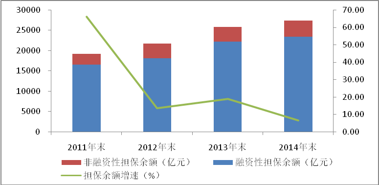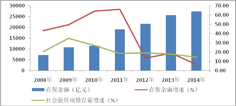 中国担保业务规模受社会融资规模影响较大,社会融资规模增长能在一定程度上拉动担保规模。相反,社会融资存量规模下降将在一定程度上抑制担保市场发展。2008年下半年起,中国实施了适度宽松的货币政策,加大金融对实体经济的支持力度,社会融资规模存量由2008年末的不到40万亿元,快速增长至2010年末的65万亿元,年均增速达30.8%。2011-2014年社会融资规模存量年均增长17.3%,增速比2009-2010年平均增速下降13.5个百分点,增速明显放缓。在此影响下,中国担保行业规模在经历了2010-2011年的快速增长后,2013年开始增速明显放缓。2014年末中国担保行业在保余额2.74亿元,同比增长6.39%,增速下降12.28个百分点。整体来看,近年来在中国宏观经济下行压力下,担保行业发展速度明显放缓。