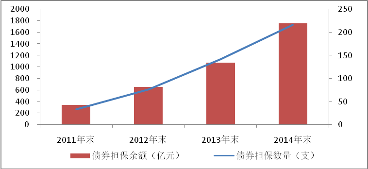 根据Wind数据统计,2014年,担保机构承保的债券新发数量217支,新发规模为1373.86亿元,同比增长77.16%;当年末,担保机构在债券市场担保余额已达到1760.23亿元,同比增长63.31%,高于融资性担保业务增速近50个百分点。担保机构在债券市场中的重要性日益凸显。未来,随中国债券市场的进一步扩容,资质水平良好的担保机构或将面临更为广阔的发展空间。
